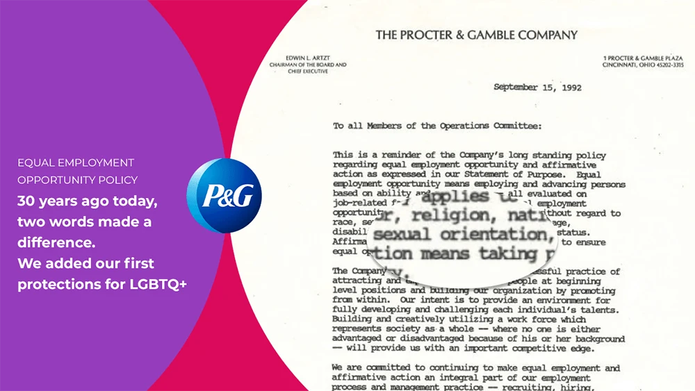 More than 30 years ago, a group of P&G employees started a movement that would leave a profound and lasting impact on our company—the inclusion of the LGBTQ+ community into P&G’s corporate equality efforts. As a result of their efforts, on September 15, 1992, P&G formally changed its diversity statement to explicitly include sexual orientation and paved the way for the later inclusion of gender identity and expression—an important step forward that only 3% of Fortune 500 companies had taken at the time.